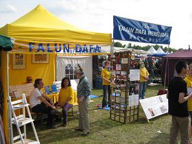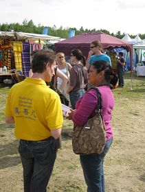一位教授太极拳十五年的太极老师也来到学员的展位。他在其它地方已经接触过法轮功。他来到法轮功学员的展位,高兴的请到了《转法轮》和《法轮功》书籍。还有其他人士也请到了《转法轮》。