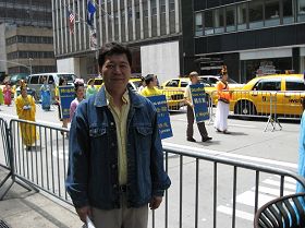 ![]() 家住法拉盛、在曼哈顿工作的王先生特意赶来为法轮功大游行助威 |