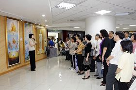先生刚过世的黄女士得知有“真善忍美展”就很迫切地想看,不知八日(星期一)休馆,白跑一趟,九日下午二点多她再度前来。她一进来感到这里很祥和,有修佛的感觉,黄女士这样对傅成瑶说。傅成瑶告诉她,自己修炼法轮功后由一个患有忧郁的人,活的很没劲,转变成乐观、对人生充满光明的希望。黄女士听了后说,“虽然我们第一次见面,可感觉到你是一位很值得信任的人,像亲人一样。”