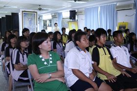 ![]() 学生们专注观看法轮功创始人李洪志先生示范教功录像,并亲身体验炼功乐趣 |