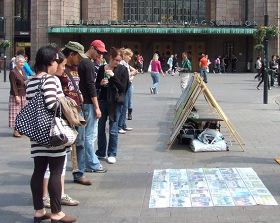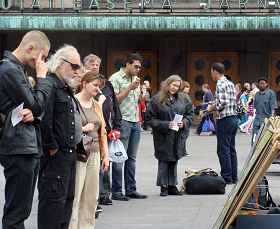 ![]() 法轮大法学员在芬兰首都赫尔辛基火车站前举办活动,传播真相 |
