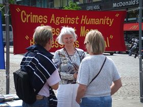 ![]() 真相横幅前,人们与法轮功学员交谈,了解更多详情 |