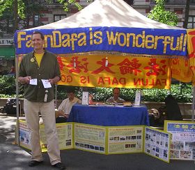 一位五十岁左右的绅士来到摊位前,和学员聊起法轮大法。他告诉学员,四年前你们在曼哈顿办反酷刑展的时候,我就知道了你们。你们要向更多的人介绍法轮功,特别是法轮功被中共迫害的事实。要坚持不懈地做。临走时,他不仅拿了法轮功简介和光盘,还拿了英文《九评共产党》光盘。