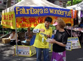 一位白人女士已经炼了四五种瑜伽,看到法轮功传单上打坐的女士,就向学员询问是否是瑜伽。学员告诉她这是来自中国的传统的修炼方式,有炼功和打坐,并告诉她在中国发生的迫害。这位女士立即表示要学习功法,并认真地盘腿,学习打坐的动作。