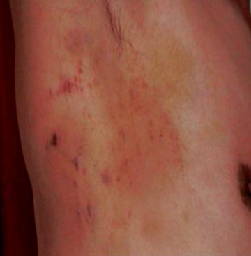 恶徒刘京兵多日来用小竹条抽打泮玉军,有一天他们非法审讯泮,让泮站在院子里两手伸直,手心向上,有一个坐在泮对面,边审问边用小竹条不时的抽打泮的双手手心。有一次恶警强制泮戴着手铐脚镣,手捧师父法像在院子里走,由于脚肿的穿不上鞋只有赤着脚。晚上半夜打泮的时候,泮喊“法轮大法好!”,刘京兵抠着泮的眼睛说:“你也知道大法好,就是不许你喊”,有一次恶警把泮玉军打得拉到裤子里,就是这样他们也没有从泮玉军嘴里得到有用信息,最后又转到看守所迫害。