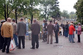 学员们来到城市老区的一个地铁站旁,打开展板,向路过的行人发资料讲真相。每张展板都图文并茂地讲述一个方面,如果看完所有的展板,人们就会对法轮大法在世界上洪传的盛况和在中国无辜遭迫害的情形有所了解。