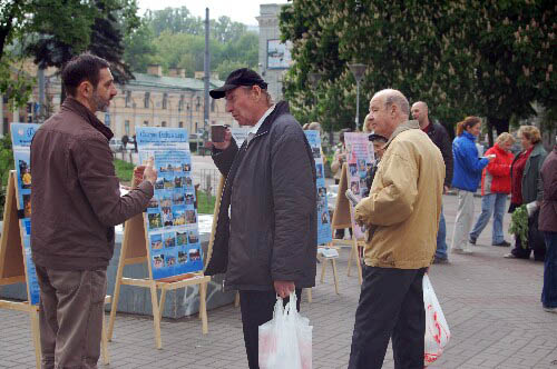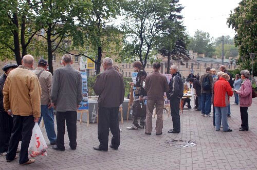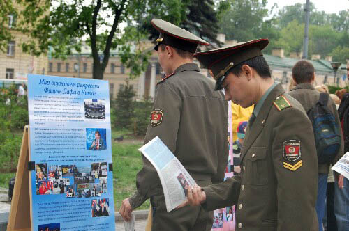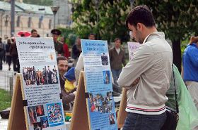 许多行人驻足观看,认真阅读展板资料,倾听学员们讲解,了解真相的人们纷纷在谴责中共迫害的签名簿上签名。