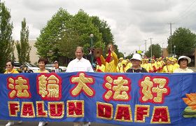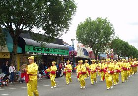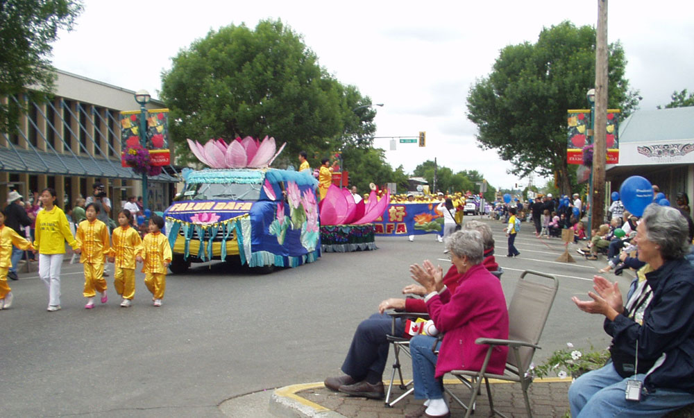 兰里市六月的游行传统已经有五十年的历史了。每年的这一天,许多市民倾家出动,坐在路边等待游行队伍的到来。参加游行的队伍打扮得多姿多彩,有穿传统长裙的淑女,有热情奔放的牛仔,有农夫,有现代企业的工人……法轮功学员是游行中唯一的一支以华人为主的队伍。