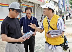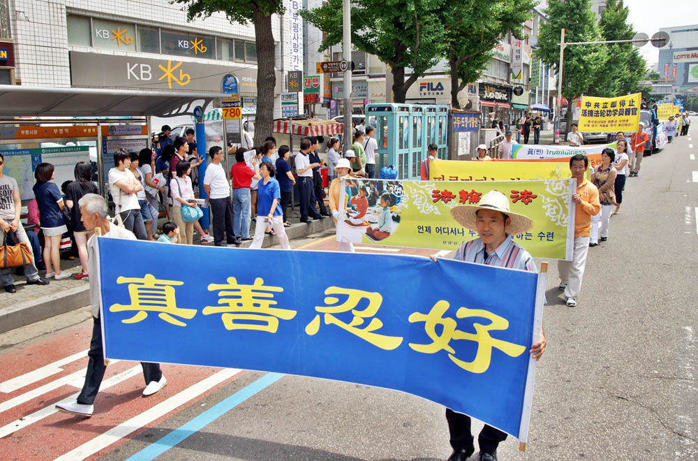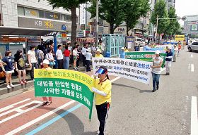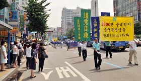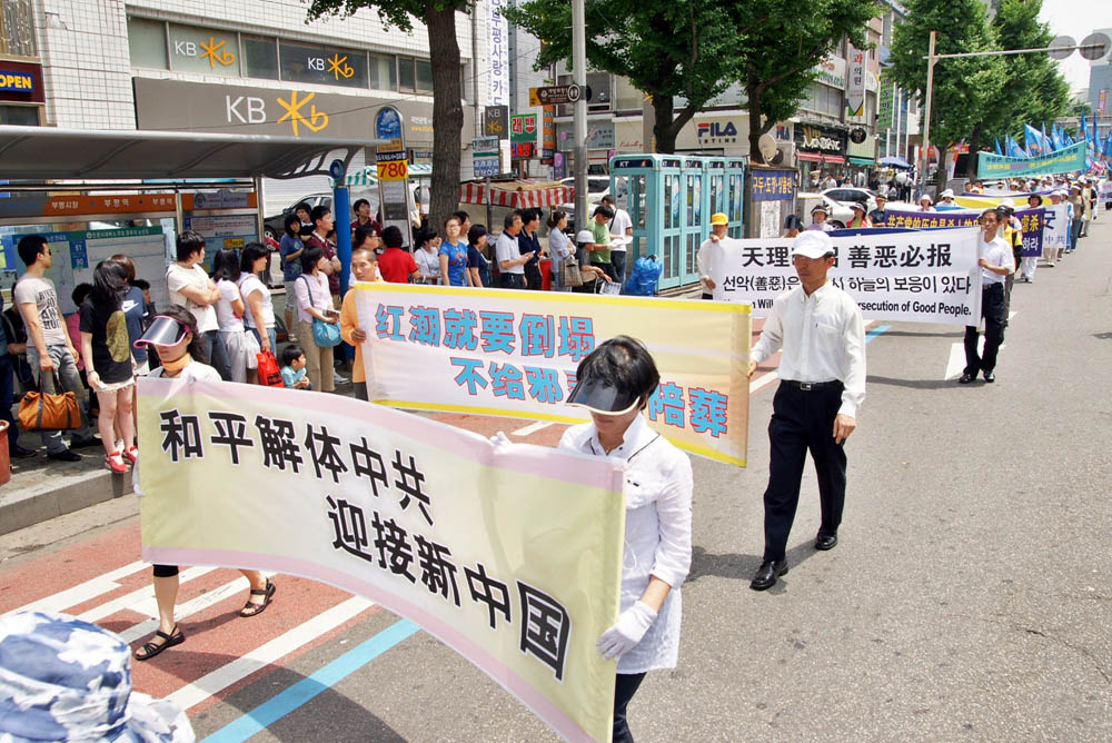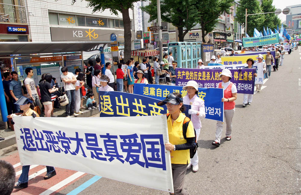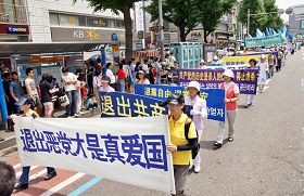 【明慧网二零零九年六月二十三日】二零零九年六月廿一日,为声援风起云涌的退出中共大潮,韩国民众在仁川市富平广场举行了声援五千六百万人三退(退出中共党、团、队)活动。一位刚来韩国一年并以“幸福”笔名退队的大陆人士表示:中共倒台那是必定的,我相信天眼最亮。