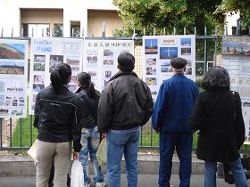 ![]() 讲述法轮功真相的展板吸引了很多华人 |