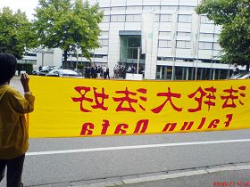 ![]() 法轮功学员对中共代表团打出“法轮大法好”横幅 |