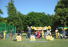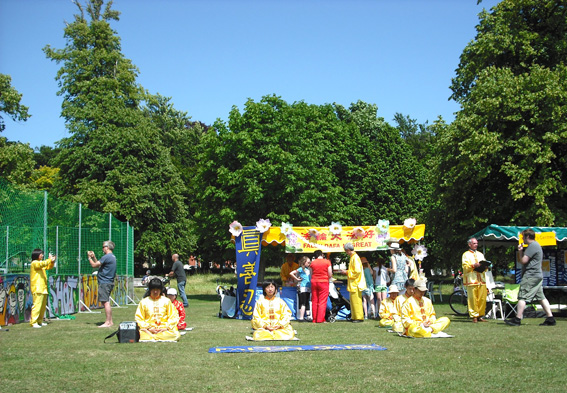 【明慧网二零零九年六月二十九日】二零零九年六月二十七日下午,英国布莱顿市普莱斯顿公园里,一年一度的布莱顿及霍伍国际体育节(Brighton & Hove International Festival of Sport)正在热火朝天的举行中。今年的体育节有八十多个团队参加,包括各类体育、健身活动和表演,吸引了大批民众。法轮功学员应邀参加了该活动,他们的功法表演受到人们的欢迎。