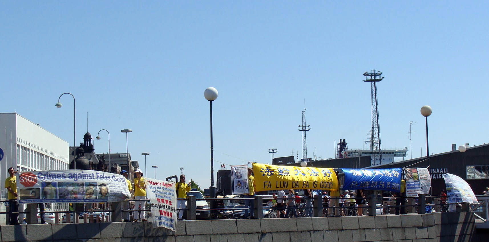 二十六日上午,法轮功学员们在芬兰总统府对面拉起了横幅,抗议中共迫害法轮功。来参加活动的学员有很多都是曾在中国经历过迫害的,有的被非法关押,有的亲人被迫害致死,有的被迫害得妻离子散。
