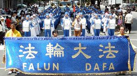 ![]() 天国乐团在行进中演奏“法轮大法好” |