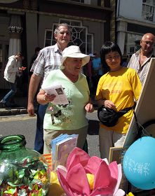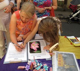 当地法轮功学员还在节日庆祝的主要街道上申请了展位,一整天摆设了法轮大法信息台。桌子上摆满了各种真相资料,一个很大的透明玻璃瓶里装满了悬挂着“法轮大法好”书签的莲花,桌子上面摆有介绍资料,鼓励人们亲手叠一个莲花,并为制止中共迫害法轮功助一臂之力;信息台的另一侧放有谴责中共迫害的征签表。