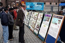 二零零九年六月六日是瑞典的国庆日,上午十一时北欧退党服务中心和部份法轮功学员在瑞典首都斯德哥尔摩的钱币广场上展示法轮功真相图片,向来自世界各地的民众揭露中共残酷迫害法轮功学员以及中共活体摘取法轮功学员器官的残暴行径,同时声援五千五百万中国勇士退出中共党、团、队的活动,中共的残暴行径引起了瑞典各界人士的关注。
