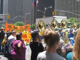 来自世界各地的法轮功学员陆陆续续加入,数千法轮功学员在曼哈顿“呼唤良知 停止迫害”的大遊行正热闹登场;在天国乐团雄浑的“法轮大法好”乐声的前导下,第一个是展现“大法洪传”的方阵,第二个则是表现“中原蒙难”方阵,第三个方阵是“解体中共 制止迫害”,最后一个方阵是“法轮大法好”。