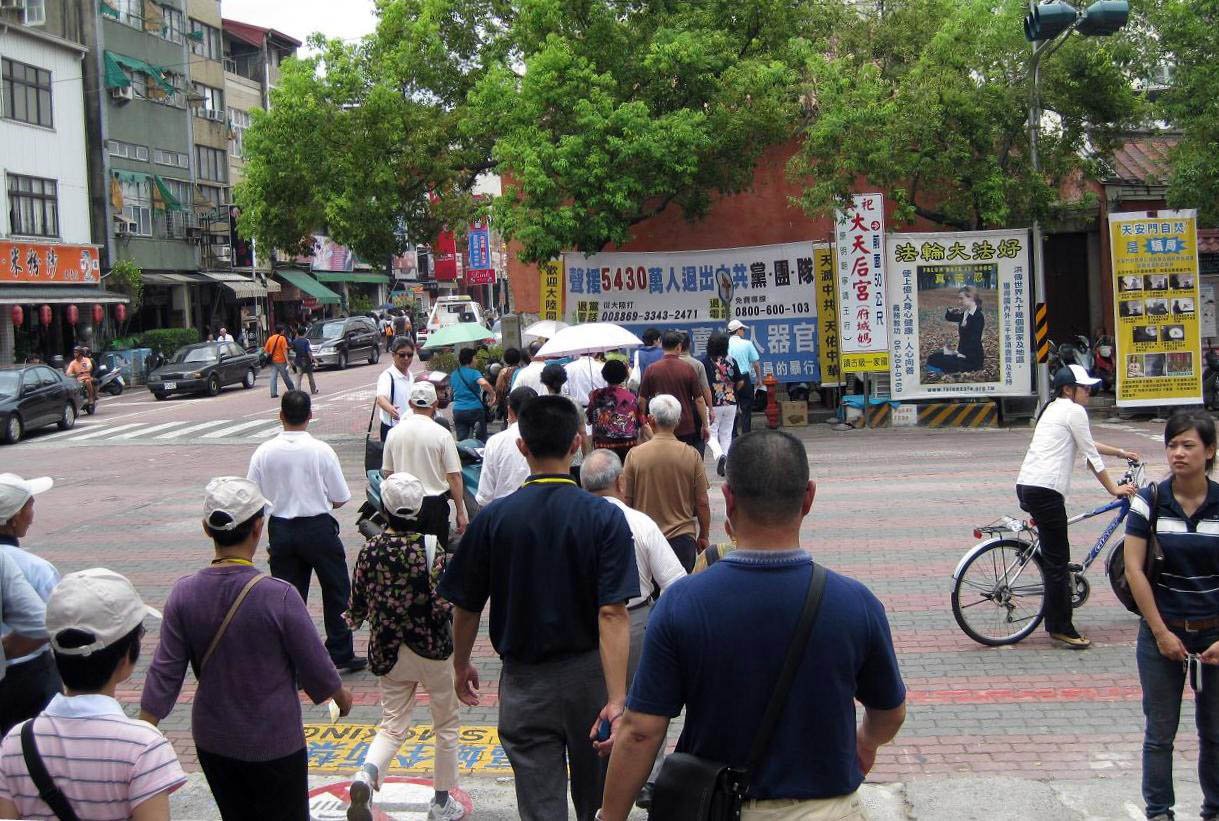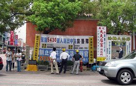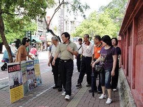 ![]() 法轮功学员在赤嵌楼人行道上展示真相图片 |