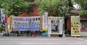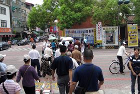 ![]() 横幅背后靠着武庙墙壁的法轮功真相展板 |