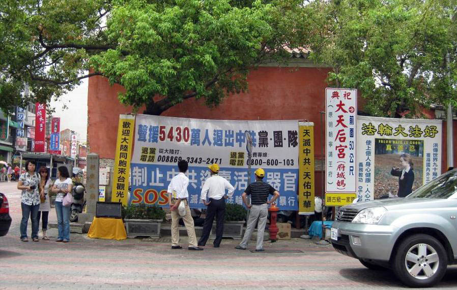 两岸开放,众多中国游客来台观光,赤嵌楼是他们来台南必访之地,这些人来到赤嵌楼,首先被眼前的大横幅所震撼:声援五千多万中国勇士退出中共党、团、队,制止中共活摘器官,法轮大法好,天安门自焚是骗局。游客们情不自禁地互相讨论并拿起相机猛拍,有些人还会特地走到对面以便看得更清楚,这时放在横幅后面的数十片展板也能映入他们的眼帘。有人看得目瞪口呆,有人发出会心的微笑,有人立即索取《九评共产党》一书。