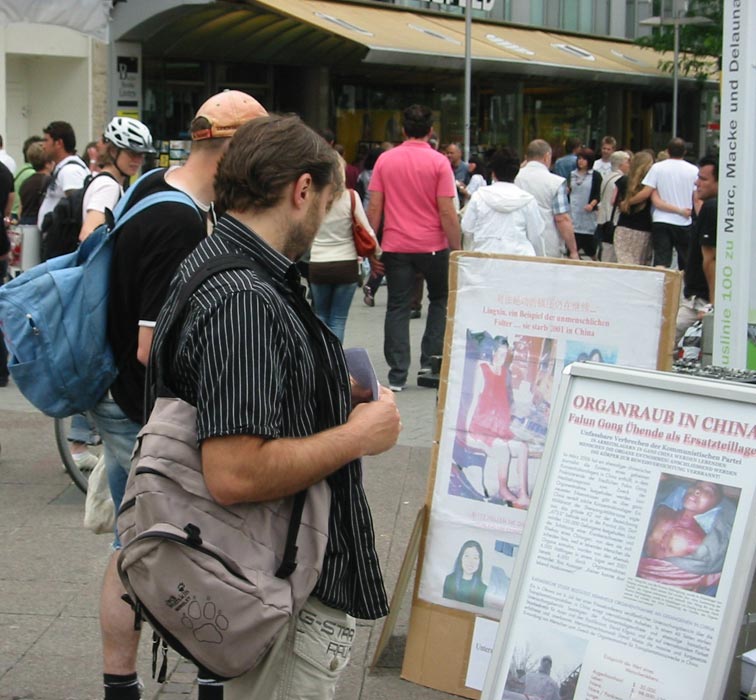 一位曾在东德生活过的小伙子来到信息日摊位前,当了解到这场迫害,特别是中共在迫害法轮功学员过程中活摘器官贩卖谋利时,他气得发抖,激动地说,他曾在东德生活,他知道共产党是个什么东西。可无论如何也不能想象中共竟然活摘器官。这太邪恶了!他说他恨不得马上到中国去,找这些参与迫害的恶人惩罚教训他们。这位小伙子还详细询问法轮功是怎么回事,并阅读了《转法轮》中的《论语》,当他读到:“‘佛法’是最精深的,他是世界上一切学说中最玄奥、超常的科学。如果开辟这一领域,就必须从根本上改变常人的观念,否则,宇宙的真相永远是人类的神话,常人永远在自己愚见所划的框框里爬行。”他说,这段话太让他信服了。