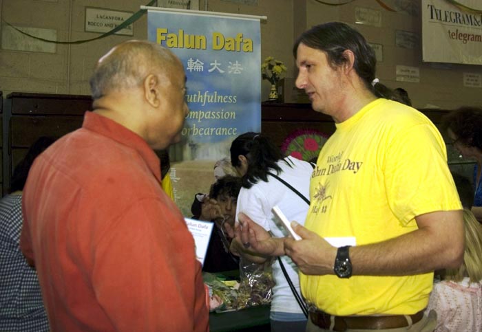 当地居民威廉·寇尔维是第一次得知法轮大法。他一走到法轮功展位附近,感觉到从学员身上散发出强大的能量场。他说看到示范功法的学员,自己“就象被磁铁吸住似的,立即想学功!”