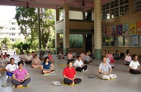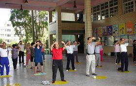 ![]() 教师研习营的教师与民众一起学炼法轮功第二套功法 |