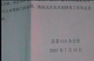 7月18日,县“六一零”在发出加强迫害的通知后,又下发了实名制排查大法学员的工作意见,该意见第3页第4个问题“排查信息工作要注意保密。不得向法轮功人员采集,防止授人以柄”,不难看出,他们所干的一切都是见不得人的勾当,是最怕曝光的。