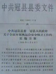 6月6日,中共冠县委抛出了【冠发二零零八•十五号】文件,以奥运的名义制订了一系列的打压政策,锁定五个大的打压对象,其中以法轮功为首。为此,成立了以县委常委、政法委书记韩金芳为总指挥,县政法委副书记、县“六一零”办公室主任任广民、县公安局长刁培昌为副总指挥的迫害法轮功指挥部,欲全力迫害法轮功。
