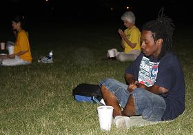 一位年轻人骑自行车路过时,停下来询问,了解真相后表示愿意一起加入。一名学员教他如何结印,如何盘腿。他默默地和学员们一起坐在烛光前,直到活动结束还久久不肯离开。当学员们已经把场地收拾干净了,他才站起来表示对法轮功感兴趣,对东方文化也感兴趣,想到炼功点来学。