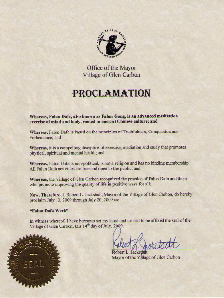 为了表示对法轮功学员十年反迫害的支持,二零零九年七月十四日,美国伊利诺州格林-卡本市(Glen Carbon)颁发了褒奖,宣布二零零九年七月十三日至二十日为该市法轮大法周。