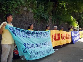 一位台湾的游客说,他几个月前去过中国。他知道现在真实的中国,中国人有很多冤屈无处伸。一位学员讲述了自己在中国亲身经历的迫害,他很震惊。学员又讲了法轮功学员为什么办退党活动,学员说:善恶终有报,今天《九评》这本书的问世,引发了到目前为止五千七百多万的退党,正是中共作恶多端的结果,是中共自己将自己打倒了。学员还讲了法轮功学员没有获得政权的企图,他们所做的一切就是揭露中共对法轮功的迫害,同时制止迫害,唤醒中国人的良知善念。那位台湾的男士听后很是感动,在离开时说:“我拍了很多照片,我保留下来,我会支持你们!”