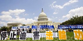 二零零九年七月十六日下午,在美国首都华盛顿DC国会山前,上千名法轮功学员举行了反迫害十周年集会,要求制止中共迫害。数十位美国国会议员、非政府组织代表和各界人士到集会现场支持声援。自二零零零年起,海外法轮功学员每年七月二十日前夕在美国首都华盛顿DC举行的系列反迫害活动,已成为海外法轮功学员反迫害活动的一种标志。