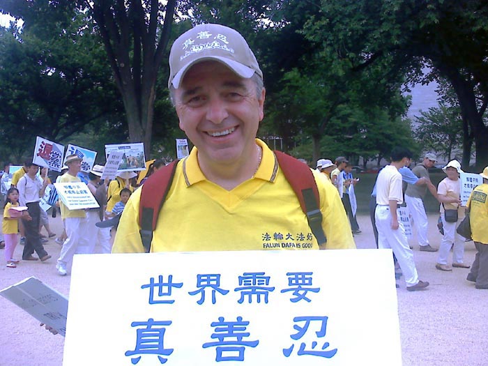 游行队伍中一位高大的西方中年男士,身穿写着“法轮大法”的黄色T-恤衫,手中举着一个白底蓝字的牌子,上面写着“世界需要真善忍”,后面是“停止迫害法轮功”中英文,十分醒目。这位西人法轮功学员名叫法瓦(Fava)。法瓦一家三口专程从意大利赶来美国华府参加此次大型活动。
