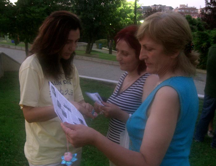 这平和的场面,吸引了很多周末来公园散步的游人。人们纷纷走上前来,要么静静地观看学员们炼功,要么认真阅读学员们递上的真相材料。看到中共活摘法轮功学员器官牟利的真相材料后,很多人谴责中共的暴行。