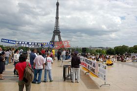 二零零九年七月十九日,法国法轮功修炼者在巴黎的埃菲尔铁塔下集会,揭露中共对法轮功长达十年的迫害真相。