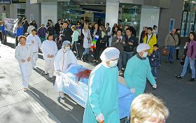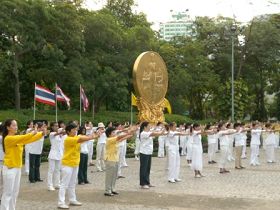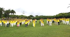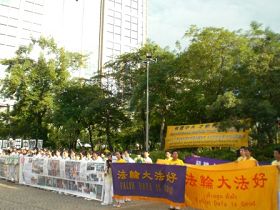 学员们在广场上再一次拉起了“停止迫害法轮功”、“法轮大法好”等横幅,一部份学员向游人们展示五套功法,另一部份学员模拟演示中共对法轮功学员所施加的部份酷刑。集会现场的周围还摆满了有关的真相展板。过往的人们纷纷驻足观看,很多人都被真相所打动,在征签表上签名谴责中共迫害。