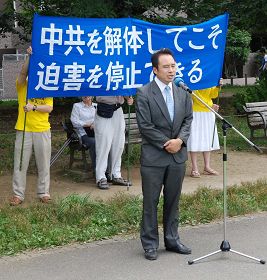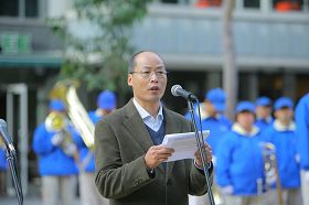 法国法轮大法协会主席唐汉龙先生在集会上发言说:“今天我们再次在此地集会,以酷刑展、功法表演、图片说明,还有音乐表演等形式,让人们了解法轮功以及在中国遭受到的迫害,提醒民众在中国大陆还有成千上万的法轮功修炼者仍然遭受着迫害,我们要继续反迫害直到迫害彻底停止那一天。”