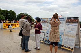 ![]() 游客和市民驻足观看法轮功展板 |