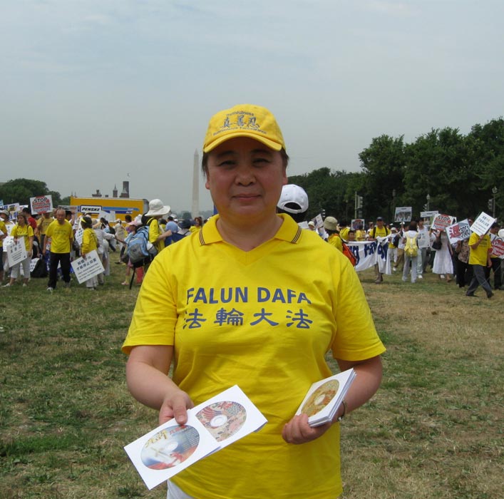 在现场遇见来自加拿大多伦多的法轮功学员王政,她正在给路人发真相资料和《九评》光盘。一九九六年得法的王政,十年来,从开始的印真相传单到后来的真相光碟和《九评共产党》光碟,她都在参与,她说: