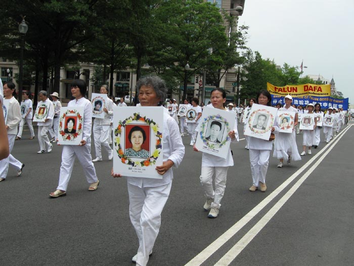 ![]() 在华盛顿DC集会游行中拉着横幅的法轮功学员王玉兰母女俩 |