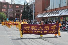 ![]() 2009年7月16日,加拿大埃德蒙顿市淘金节游行上的法轮功队伍 |
