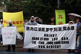 有路人听完法轮功学员的介绍,明白了真相后,主动站到学员的队伍中,手扶着“法办江泽民、罗干、刘京、周永康”的横幅照相留念,以表示他对法轮功学员的支持。