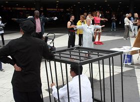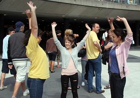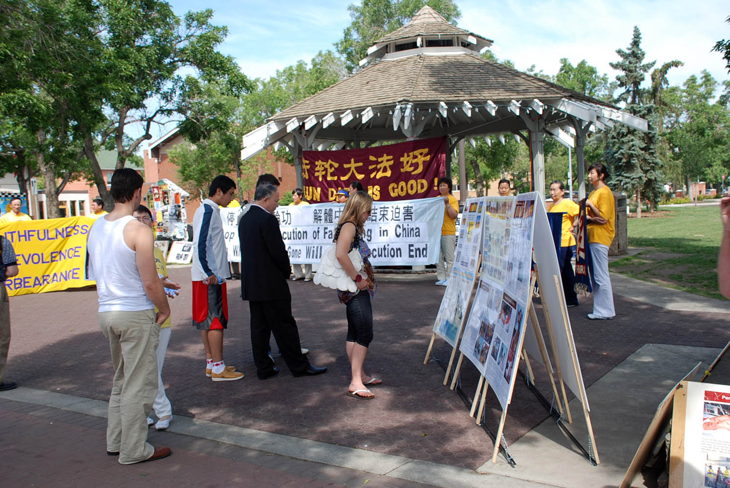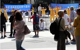 虽然烈日炎炎,法轮功学员宁静祥和的炼功场面吸引了很多过往的游客。在随后举行的集会上,美国不同族裔人士以演奏音乐、表演歌曲或发表演讲的形式,呼吁国际社会关注已持续了十年之久的这场中共针对法轮功的迫害,为中国大陆的法轮功学员争取自由。