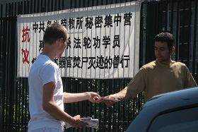 ![]() 法轮功学员在纽约中领馆前集会,呼吁制止迫害。 |