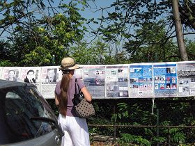 大陆来台的观光旅行团和考察团,由游览车一车一车地载来参观全球最高楼、台湾的地标“台北一零一”。隔着对街望去,八条巨大醒目的横幅“紧急救援在中国被迫害的法轮功学员”、“法轮功教人修炼真、善、忍”、“解体中共才能停止迫害”、“声援五千七百万人退出中国共产党”等就在他们的眼前。