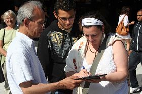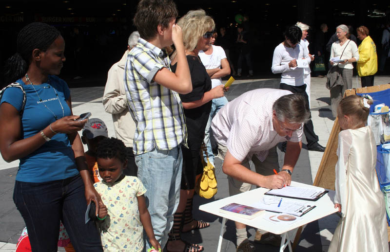 一位回教徒站在路边观看游行队伍,许久不愿离去,他说真想不通中共为何要迫害这么平和善良的法轮功学员呢?学员告诉他,因法轮功学员是以“真善忍”为修炼准则,说真话、办真事,做真人,要慈悲为怀,以大善大忍的精神向世人讲清真相,揭露迫害。而中共却是背道而驰,以假、恶、斗起家,害怕宇宙真理“真善忍”,害怕做坏事曝光,因而迫害修炼人。他明白后对法轮功学员说:“我支持你们!”
