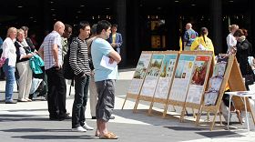 ![]() 法轮功和平反迫害大游行,吸引许多民众及大陆游客观看 |