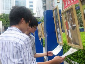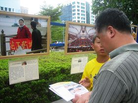 一位从大纪元时报看到活动讯息,特地从新庄来了解真相的吴先生,一面看着图片,一面听着法轮功学员的解说,感慨地说,以前接收一些媒体对法轮功不实的报导,对法轮功有些误解,今天亲眼看到这些真相,真是不虚此行。