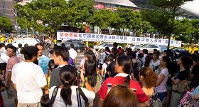 在人潮聚集的一零一大楼对面的马路边,八条中英文对照的大横幅,写着“酷刑虐杀还在中国发生”、“紧急救援在中国被迫害的法轮功学员”、“法轮功教人修炼真、善、忍”、“中共迫害真、善、忍”、“法轮大法好”、“解体中共才能停止迫害”、“中华儿女不做马列子孙”及“声援五千七百万人退出中共恶党”,醒目地依序展开。